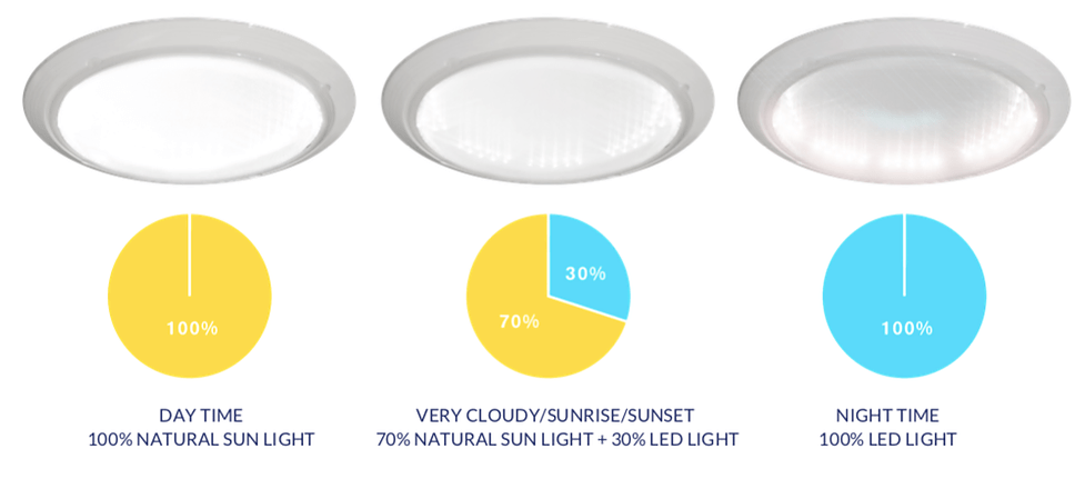 During the daytime, the lighting from the entire space comes from the natural sunlight. As evening approaches and the day starts getting cloudier, the LED starts to light up to compensate for the reduction of sunlight to always keep the same level of illumination into the space which can be pre-set or adjust by our Lumina Light controller.