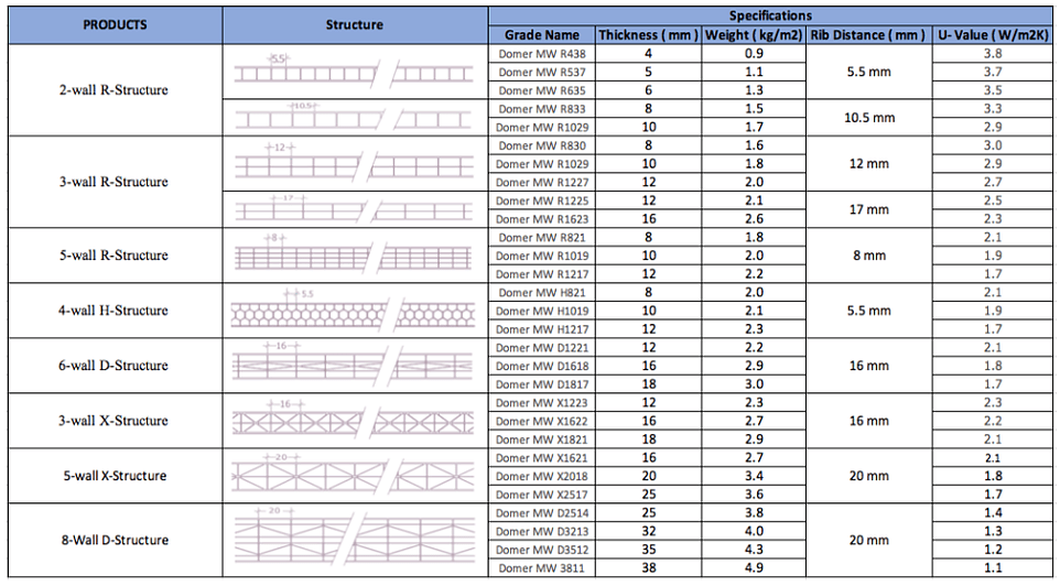 Domer Duratherm polycarbonate panels come in a wide range of structures, mainly defined as following: